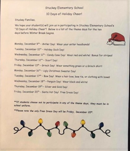 Each day this week is a themed dress day. If students do not choose to wear the themed dress, they must dress in standard student attire.