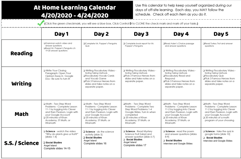 Attached is this week’s at home learning calendar. This is also located in your student’s distance learning section of Google Classroom.