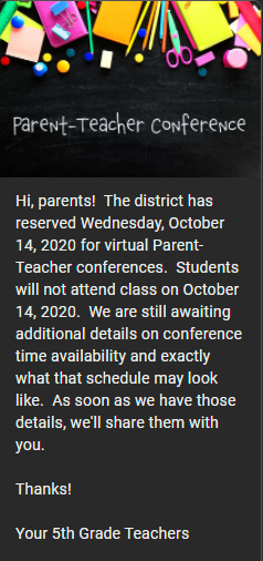 Parent-Teacher Conferences Image• Posted on September 15, 2020 by msbinclass Share this: Click to share on X (Opens in new window) X Click to share on Facebook (Opens in new window) Facebook Like Loading... Related Author: msbinclass View All Posts