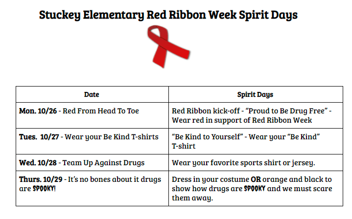 Stuckey Elementary will be taking part in a week long, district-wide program called Red Ribbon Week, October 26th – October 29th . Red Ribbon Week was designed to create an awareness concerning the problems related to the use of tobacco, alcohol, and other drugs. The national theme this year is “Send A Message. Stay Drug Free.”
