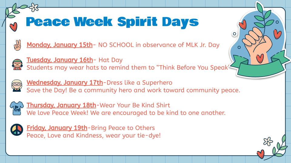 We wrapped up our SEL unit on inclusion last week, and students are creating slides in Canva to showcase what inclusion means to them. This ties right into our spirit week for next week, which is Nevada Peace Week. Please see the spirit days below. We have a different dress day each day of the week.