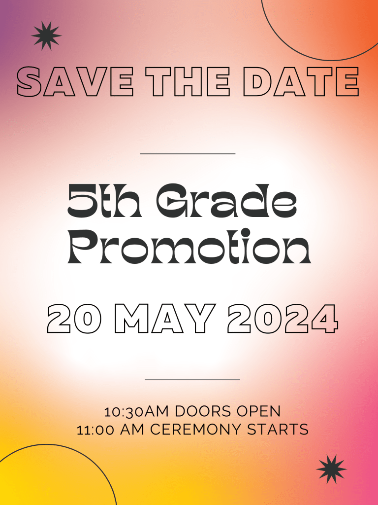 As we approach the end of the school year, we grow nearer to our 5th grade promotion. Please see the save the date flyer. Additionally, as a part of our program, we would like you to submit a baby picture of your child through this google form. Instructions are at the top of the google form as well.
